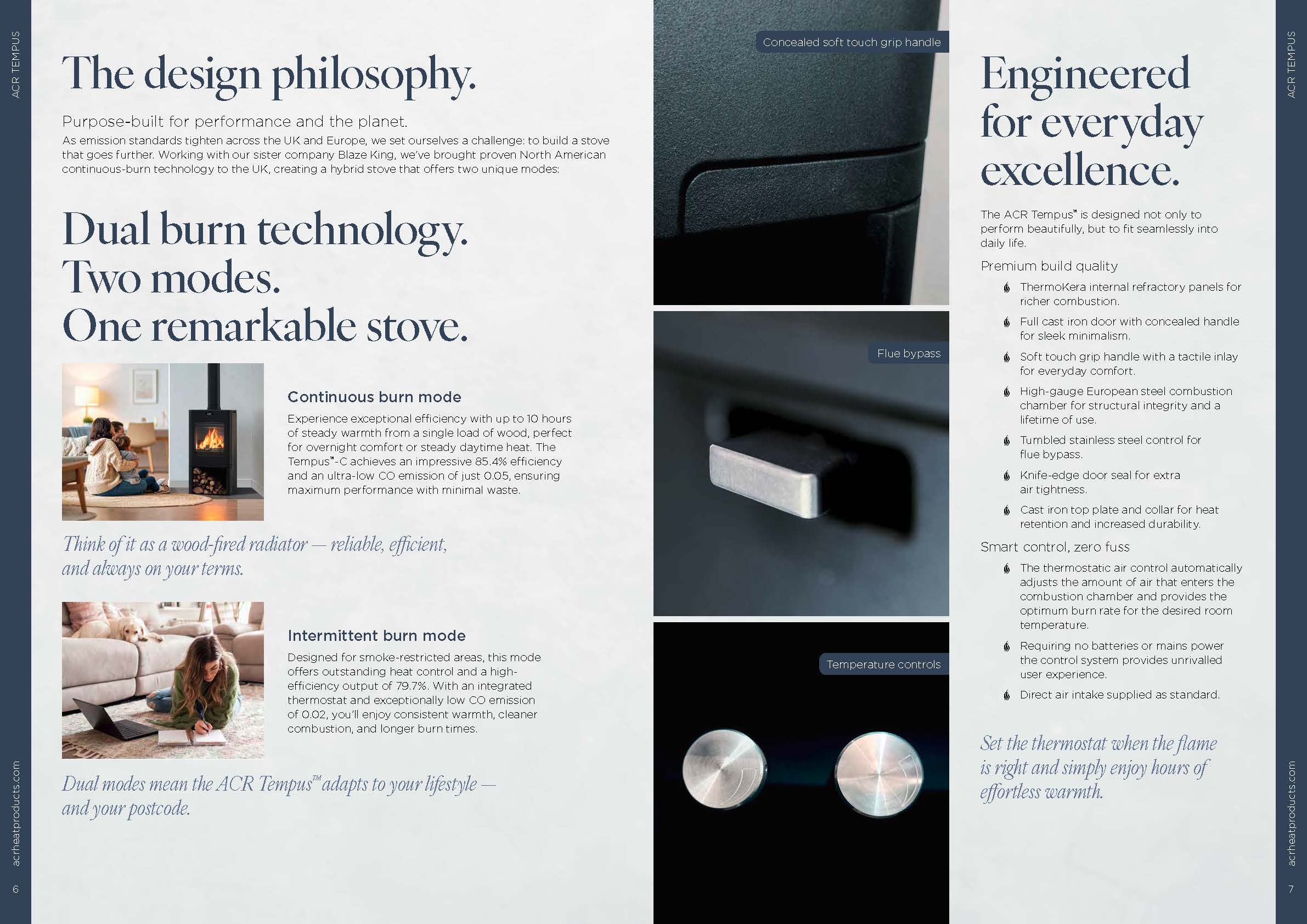 Developed with inspiration from ACR’s Canadian sister company, Blaze King, the Tempus™ brings proven long-burn technology to the UK market, delivering impressive burn times from a single load of wood while creating a striking focal point in any room.